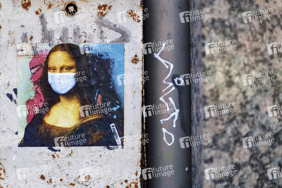Die Kölner Künstlerin Ursula Düster hat einen Sticker mit der Kölschen Mona Lisa mit Mundschutz entworfen, der Aufkleber hängt an 60 Standorten in Köln anlässlich der Coronakrise. Köln, 31.10.2020