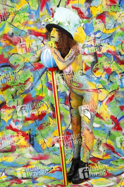 Das World Bodypaiting Festival 2020 fand aufgrund der Corona-Pandemie online statt. Unter dem vorgegebenen Motto 'Psychedelic Circus' verwandelte BodyArt-Künstler Jörg Düsterwald sein Model Lena in einen psychedelischen Mad Hatter. Hameln, 10.07.2020