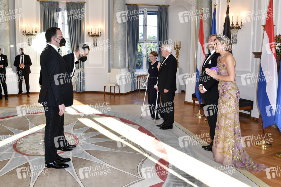 Jens Spahn, Daniel Funke, Elke Büdenbender, Frank-Walter Steinmeier, König Willem-Alexander und Königin Maxima der Niederlande beim Defilee zum Staatsbankett zu Ehren von König Willem-Alexander der Niederlande und Königin Maxima, gegeben vom Bundespräsidenten und Elke Büdenbender im Schloss Bellevue. Berlin, 05.07.2021