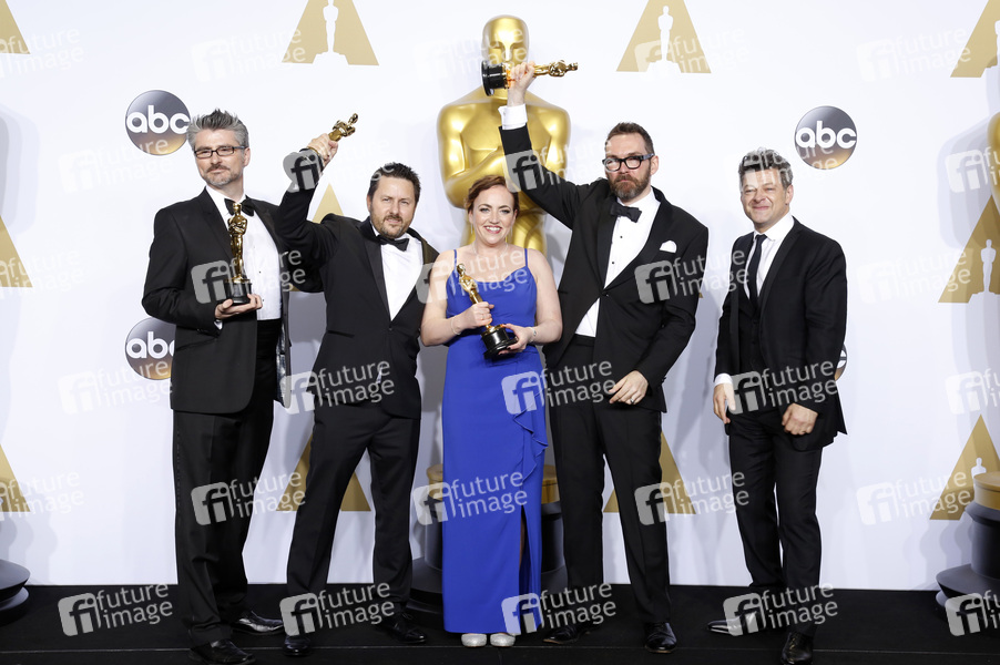Mark Williams Ardington, Paul Norris, Sara Bennett, Andrew Whitehurst (Beste visuelle Effekte bei 'Ex Machina') und Andy Serkis im Presseraum der Oscar Verleihung 2016 / 88th Academy Awards im Loews Hollywood Hotel. Los Angeles, 28.02.2016