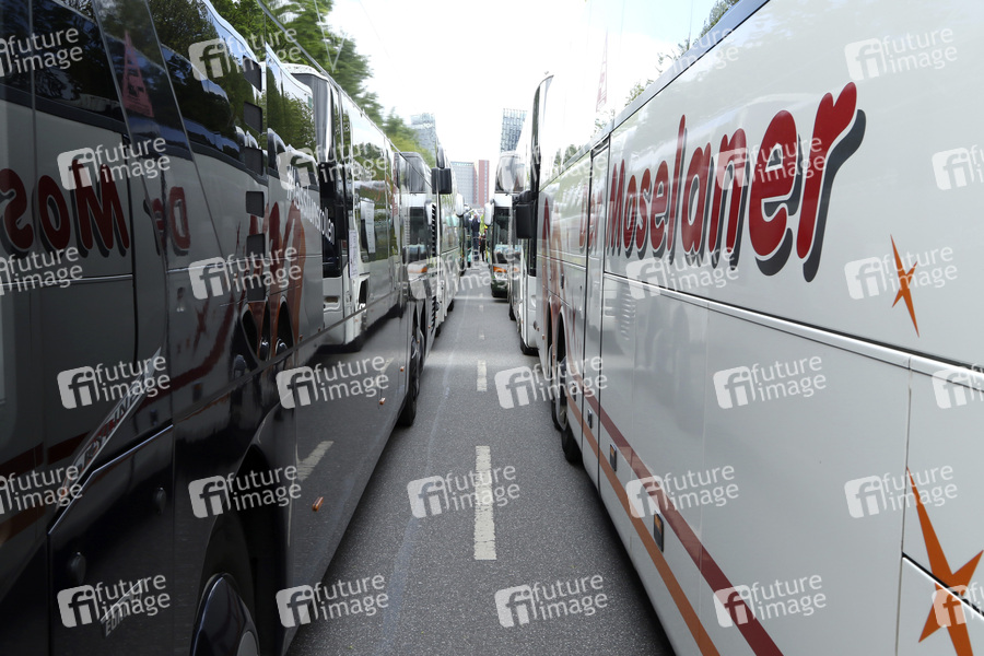 Unter dem Motto 'Rettung der flexiblen und individuellen Reise-Busbranche' demonstrieren Busunternehmer aus Norddeutschland mit einem Konvoi von Reisebussen gegen die aktuellen Reisebeschränkungen aufgrund der Corona-Pandemie. Hamburg, 07.05.2020