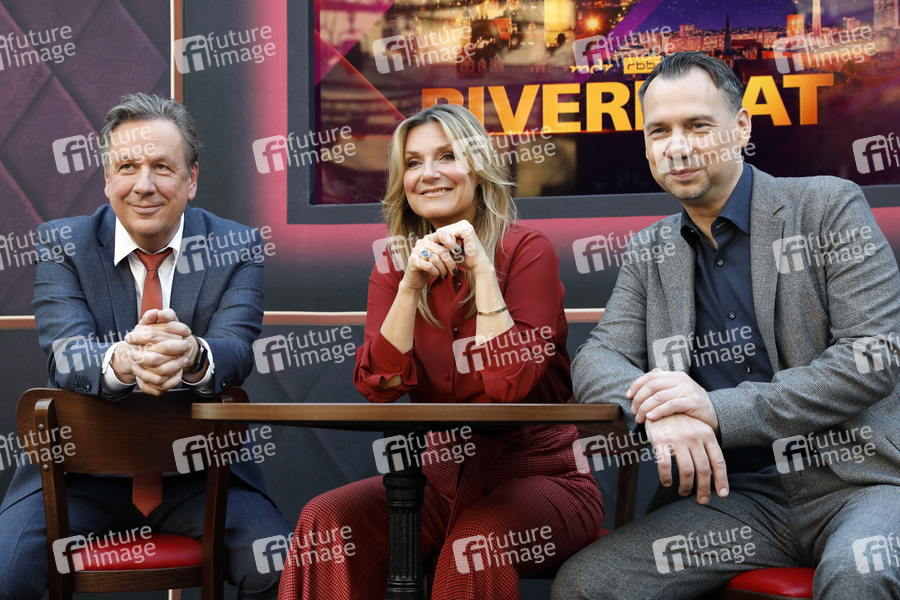 Jörg Kachelmann, Kim Fisher und Sebastian Fitzek beim Pressetermin zur MDR/rbb-Talkshow 'Riverboat' in der Riverboat-Kulisse im Mediengarten der Media City Leipzig. Leipzig, 08.10.2021