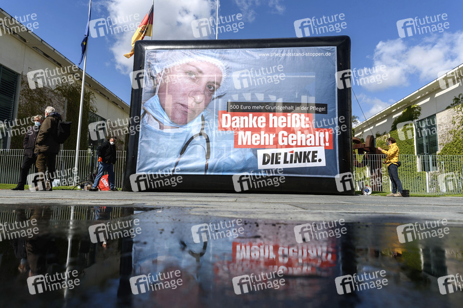 Zum Tag der Pflege protestiert die Partei DIE LINKE vor dem Bundeskanzleramt gegen den Pflegenotstand in der Coronakrise. Sie fordern ein krisenfestes Gesundheitssystem mit verbesserten Arbeitsbedingungen für das Pflegepersonal sowie 500 Euro mehr Grundgehalt in der Pflege. Die Protestkundgebung findet im Rahmen der Kampagne 'Menschen vor Profite: Pflegenotstand stoppen' statt. Berlin, 11.05.2020