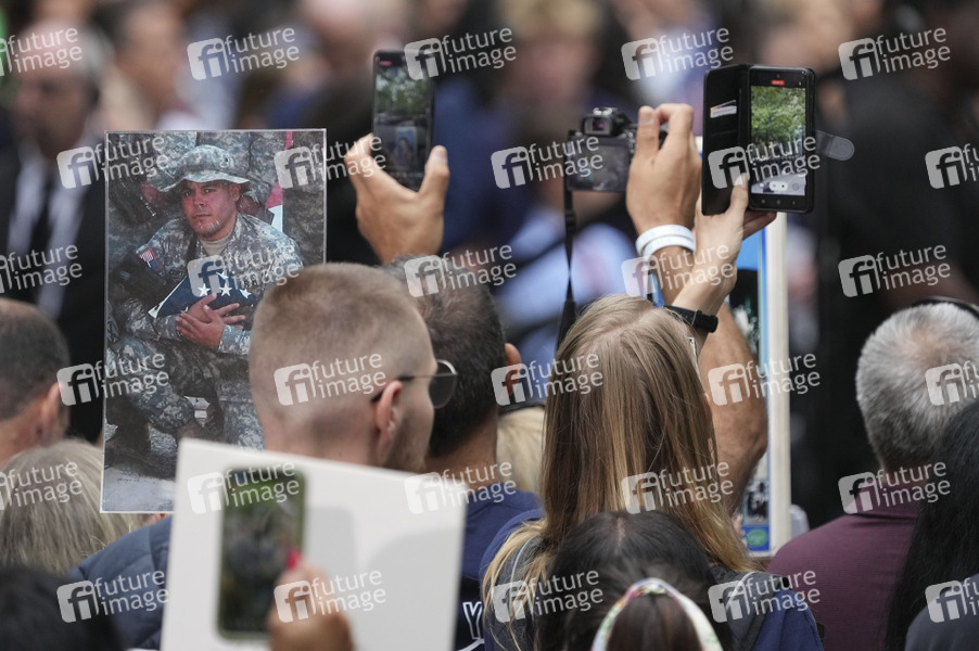 Fotos von Anschlagsopfern bei der Gedenkfeier für die Opfer der Terroranschläge vor 21 Jahren am 9/11 Memorial. Mit Schweigeminuten und der Verlesung der Namen der fast 3000 Todesopfer haben die USA am Sonntag an die Terroranschläge vom 11. September 2001 erinnert. Am früheren Standort des World Trade Centers in New York verlasen Angehörige wie jedes Jahr am 11. September die Namen aller Anschlagsopfer. New York, 11.09.2022