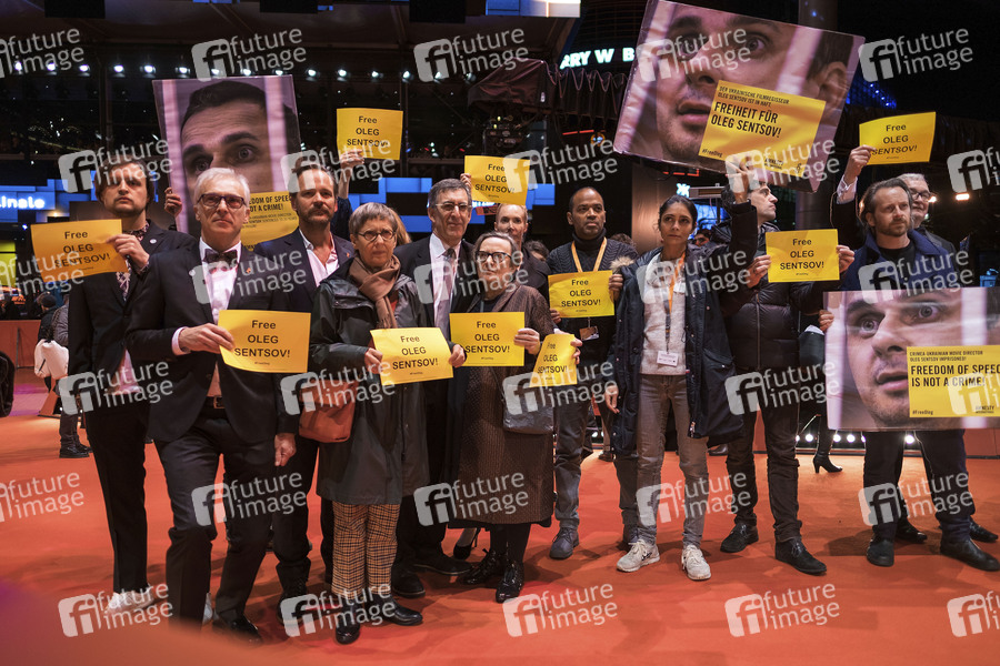 Peter Sarsgaard, Agnieszka Holland und Aktivisten fordern die Freilassung des in Russland inhaftierten Filmregisseurs Oleg Sentsov bei der Premiere von _Mr. Jones auf der Berlinale 2019 / 69. Internationale Filmfestspiele Berlin im Berlinale Palast. Berlin, 10.02.2019