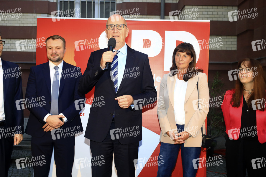 Dietmar Woidke mit Ehefrau Susanne Woidke und Parteifreunden bei der Wahlparty der SPD nach der Landtagswahl 2024 in Brandenburg in der Gaumenarche. Potsdam, 22.09.2024