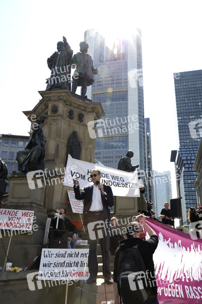 Demonstrationen gegen Corona-Beschränkungen - Hajo Köhn, ehemaliger Sprecher von Attack und Occupy, bei einer Rede am Gutenberg-Denkmal auf dem Rossmarkt. Frankfurt, 16.05.2020