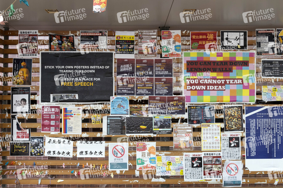 Die Lennon Wall für studentische Redefreiheit.Die Gedenkwand mit Protestplakaten für Demokratie wurde am Samstag, dem 11. Juli 2020 geräumt. Mindestens acht nicht identifizierte Personen haben, nach Angaben des Studentenwerks, das Forum für Demokratie an der Universität von Hongkong zerstört. Hongkong, 24.05.2020