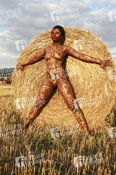 Bodypainting, Erotik, Frau, Mädchen, Afrikanerien, nackt, draußen, weiblich, Körperkunst, Kunst, Ornamente, Malerei, Feld, Acker, Stoppelfeld, Heuballen, Stroh, Landwirtschaft, Ernte, Abendsonne, erotic, African woman, girl, nude, outdoor, female, body art, body painting, ornaments, field, hay, straw, farming, harvest, evening sun