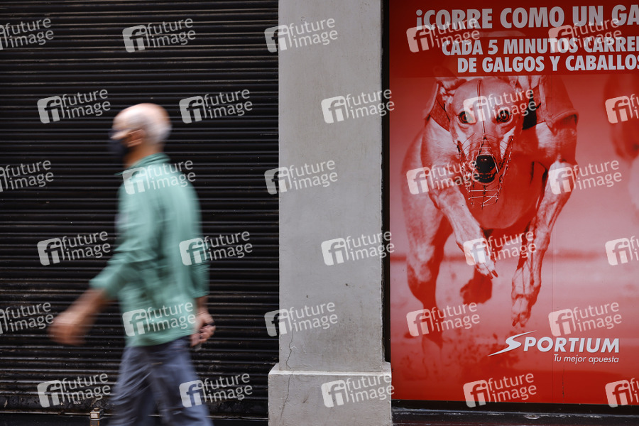 An einem Wettbüro des Wettanbieters Sportium in Santa Cruz de Tenerife hängt eine Außenwerbung, die einen Winhund zeigt, wie er bei landestypischen Hunderennen zum Einsatz kommt. Hunderennen sind in Spanien beliebt. (Themenbild, Symbolbild) Teneriffa, 24.11.2021