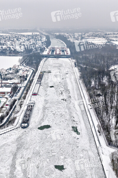 Hannover Anderten, Kanal, Wasserstraße, Gewässer, Eis, gefroren, zugefroren, Schneetreiben, Winter, gefrierende Nässe, Kälteeinbruch, Schneefall, Schnee, Schneegrenze, Schneematsch, Glätte, glatt, Frost, Wetter, Glättegefahr, Glatteis, Glatteisgefahr, Temperatursturz, Winterdienst, Streusalz, Schneeglätte, Deutscher Wetterdienst, winterlich, kalt, Schnee-Chaos, Luftaufnahme, Luftbild, Drohne, Drohnenaufnahme, Themenfoto, Symbolbild, Themenbild, Symbolfoto