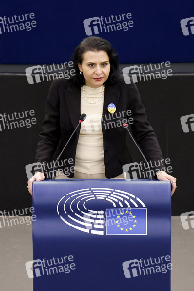 Abir Al-Sahlani im Plenarsaal des Europäischen Parlaments. Straßburg, 07.03.2022