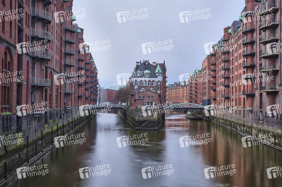 Teekontor im Wasserschloss fotografiert von der Poggenmühlenbrücke in der Speicherstadt. Hamburg, 03.03.2020