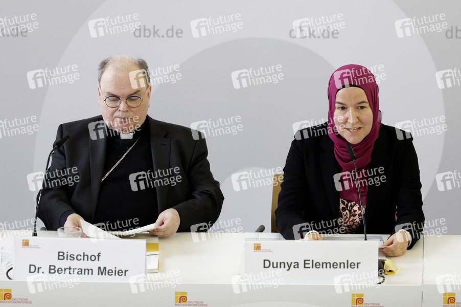 Bertram Meier und Dunya Elemenler beim Pressegespräch zum Thema 'Dialog zwischen Christen und Muslimen - Kontinuität und Wandel' im Rahmen der Frühjahrsvollversammlung der Deutschen Bischofskonferenz im Burkardushaus. Würzburg, 25.02.2026