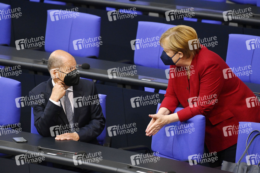 Olaf Scholz und Angela Merkel in der 238. Sitzung des Deutschen Bundestages im Reichstagsgebäude. Berlin, 25.08.2021