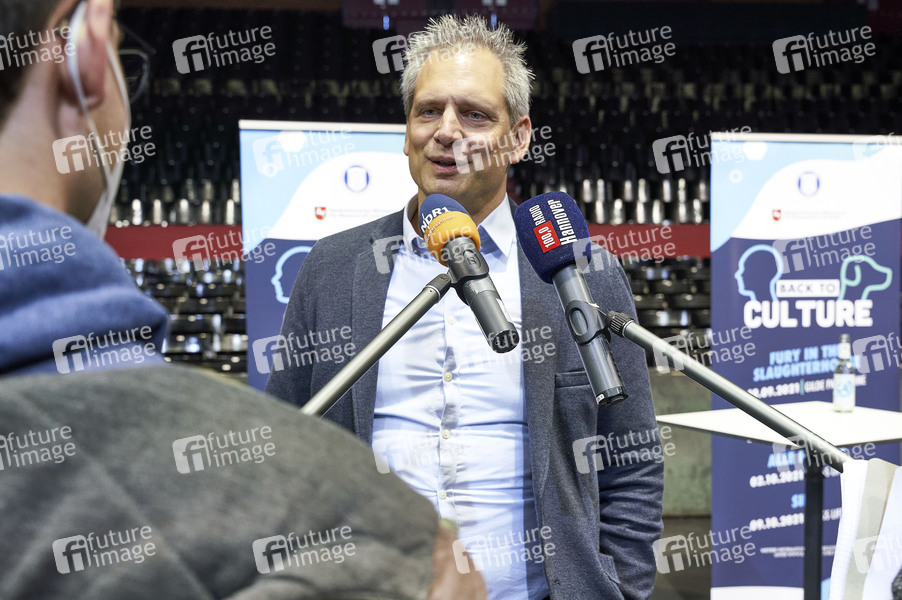 Professor Dr. Holger Volk (Leiter der Klinik für Kleintiere der TiHo) bei der Prästentation der Konzertreihe 'Back to Culture' in Verbindung mit einer Teststudie mit Corona-Spürhunden in der Swiss Life Hall. Hannover, 19.09.2021