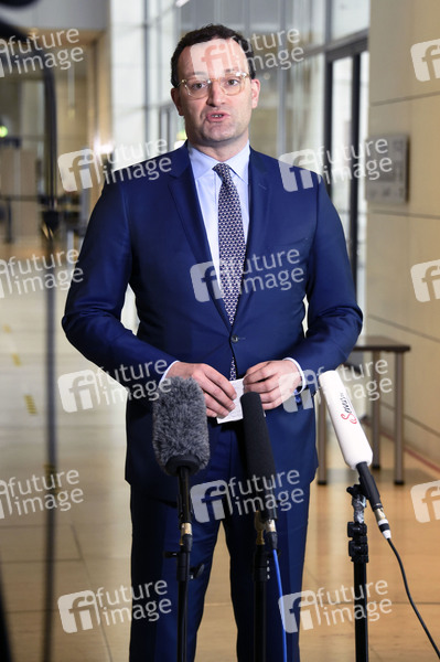 Gesundheitsminister Jens Spahn beim Pressestatement zur Verteilung von FFP2-Masken an Hartz-IV-Empfänger am Rande der 206. Sitzung des Deutschen Bundestages in der 'Westlobby', dem Aufenthaltsbereich vor dem Plenarsaal auf der Westseite im Reichstagsgebäude. Berlin, 28.01.2021