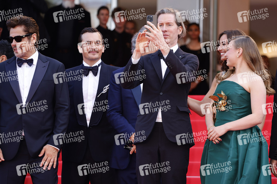 Benicio del Toro, Rupert Friend, Wes Anderson und Mia Threapleton bei der Premiere des Kinofilms 'The Phoenician Scheme / Der phönizische Meisterstreich' auf dem Festival de Cannes 2025 / 78. Internationale Filmfestspiele von Cannes im Palais des Festivals. Cannes, 18.05.2025