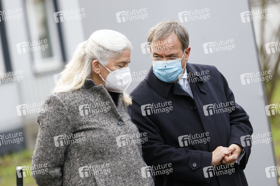 Isabel Pfeiffer-Poensgen und Armin Laschet bei enem Pressestatement vor dem Universitätsklinikum Düsseldorf. In Rekordzeit hat das UKD eine räumlich vollständig getrennte Neubau-Einheit zur Versorgung von COVID-19-Patienten erbaut. Das Gebäude bietet 18 Intermediate-Care-Plätze und 25 Intensivplätze. Damit verfügt das Universitätsklinikum über eine der modernsten Intensiveinheiten Europas. Düsseldorf, 30.12.2020