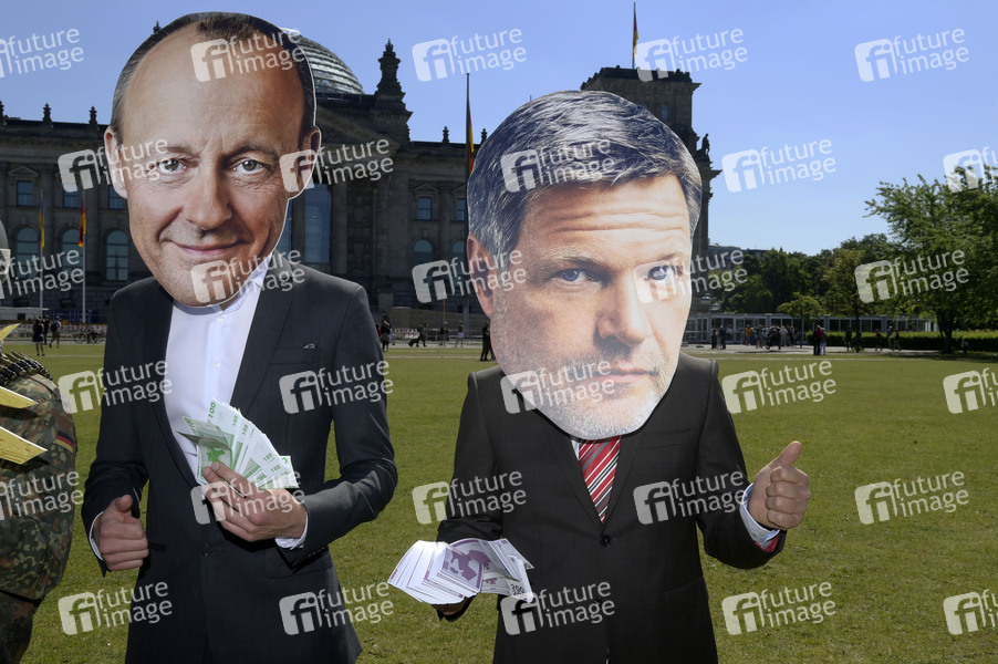 Aktivisten bei einer Protestaktion gegen das sogenannte Sondervermögen von 100 Milliarden für die Bundeswehr vor dem Reichstagsgebäude. Berlin, 03.06.2022