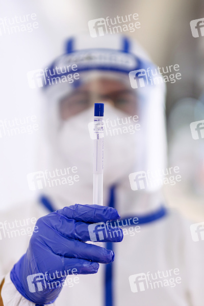 Wegen der Corona-Krise bzw. Corona-Pandemie werden im Corona-Testzentrum am Köln Bonn Airport Reiserückkehrer aus Risikogebieten auf Corona getestet. Köln, 11.08.2020