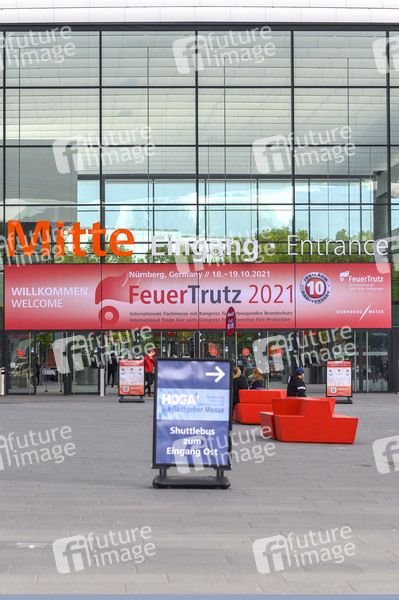 Eingang zur FeuerTrutz, der internationalen Fachmesse mit Kongress für vorbeugenden Brandschutz, in der NürnbergMesse. Nürnberg, 18.10.2021