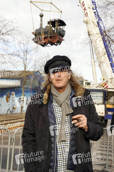 Ein weiteres Filmrequisit für die 'Giant Props' Sammlung ungewöhnlicher Originale, die Lokomotive Emma aus den Jim Knopf Filmen, wird auf der Straße der Giganten im Filmpark Babelsberg aufgestellt. Filmparkchef und 'Lokomotivführer' Friedhelm Schatz organisiert den Transport. Potsdam, 16.11.2020
