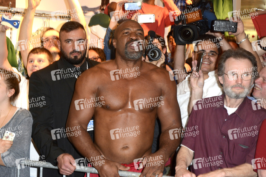 Shannon Briggs stört beim Einwiegen anlässlich des WM-Boxkampfs Wladimir Klitschko vs Alex Leapai in den Karstadt Arkaden vom Rhein-Ruhr Zentrum. Mülheim an der Ruhr, 25.04.2014
