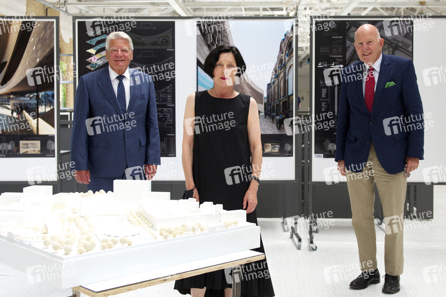 Joachim Gauck, Herta Müller und Christoph Stölzl am Gewinner-Modell vom Büro Dorte Mandrup aus Kopenhagen bei der Pressekonferenz mit Photocall zum Realisierungswettbewerb für das künftige Exilmuseum in der Station Berlin. Berlin, 14.08.2020