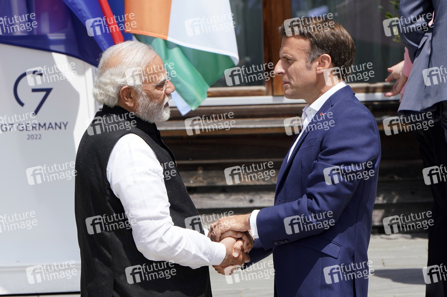 Narendra Modi und Emmanuel Macron beim Fototermin zum erweiterten Familienfoto im Rahmen der Outreach-Arbeitssitzung am zweiten Tag des G7-Gipfels auf Schloss Elmau. Die Staats- und Regierungschefs der G7-Gruppe kommen offiziell unter dem Motto 'Fortschritt hin zu einer gerechten Welt' zusammen und werden globale Themen wie Krieg, Klimawandel, Hunger, Armut und Gesundheit diskutieren. Der Gipfel wird vom anhaltenden russischen Krieg gegen die Ukraine überschattet. Klais, 27.06.2022