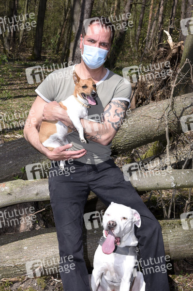 Dave Kaufmann mit seinem Hund Dean Martin und seiner Hündin Lieselotte bei einem exklusiven Fototerin während eines Spaziergangs. München, 17.04.2020