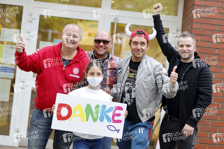 DJ Düse, Buddy, Lorenz Büffel und DJ Chris Mega mit Arche-Besucherin bei der Überreichung des Spendenschecks für die Kölner Arche. Mallorca-Stars haben beim großen Mallorca Opening 2021 auf der Streamingplattform Twitch rund 14.000 Euro für den guten Zweck gesammelt. Köln, 18.05.2021