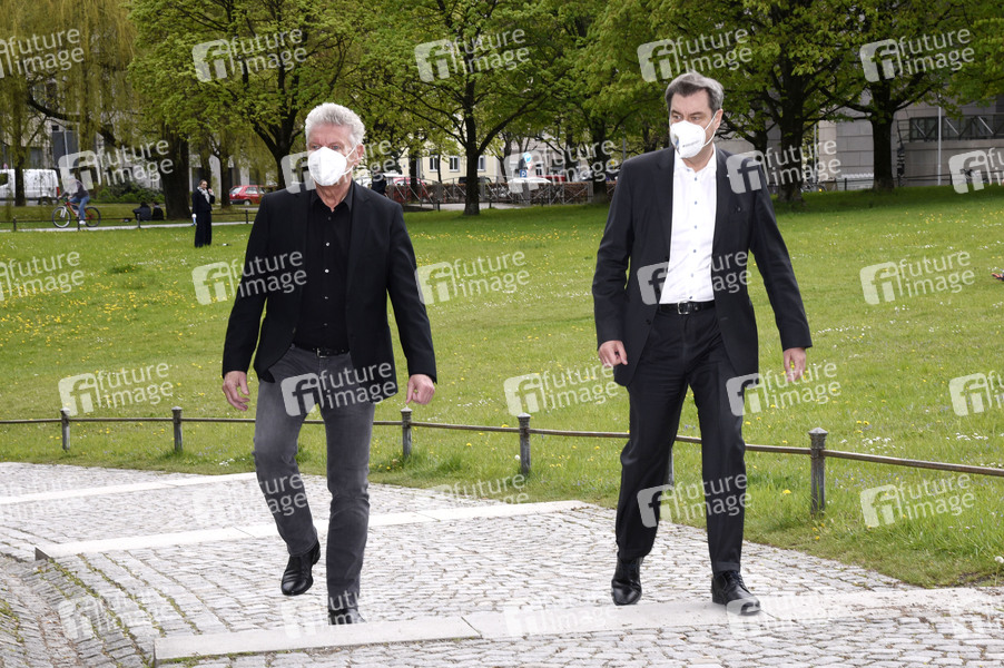 Dieter Reiter und Markus Söder bei der Pressekonferenz zur Absage vom Oktoberfest 2021 und zur diesjährigen Volksfest-Saison in Bayern im Foyer des Prinz-Carl-Palais. München, 03.05.2021