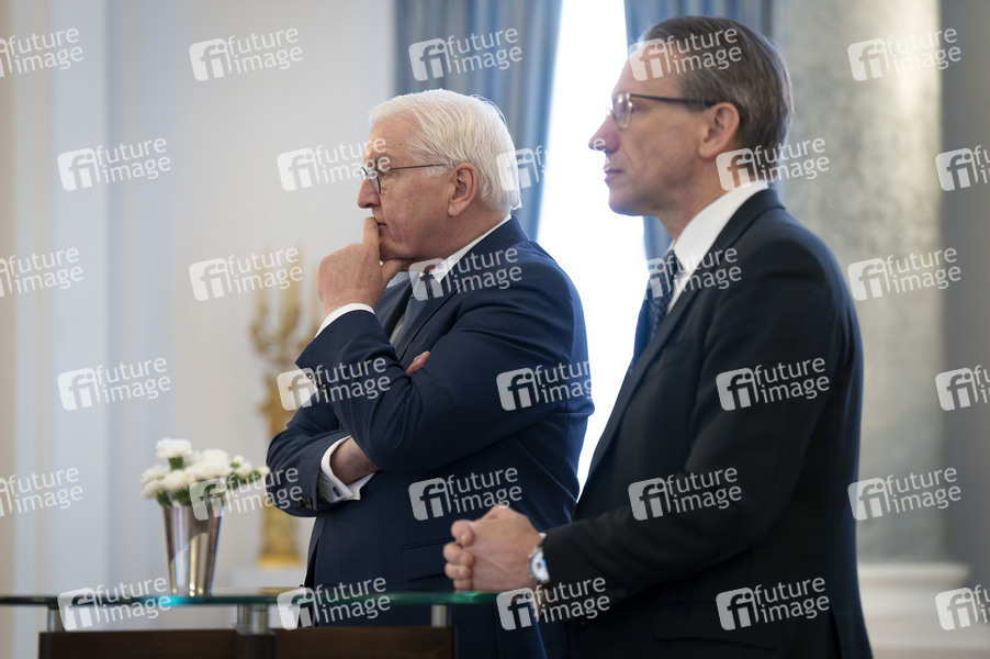 Frank-Walter Steinmeier und Jörg Kukies bei der Übergabe der Wohlfahrtsmarken 2025 durch den Bundesminister der Finanzen an den Bundespräsidenten im Schloss Bellevue. Berlin, 21.02.2025