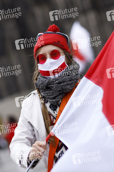 Demonstranten der 'Kundgebung für Demokratie in Belarus' protestieren mit Mundschutz wegen Corona auf dem Roncalliplatz gegen Lukaschenko und das Vorgehen der Regierung in Weißrussland gegen die Opposition. Köln, 22.11.2020