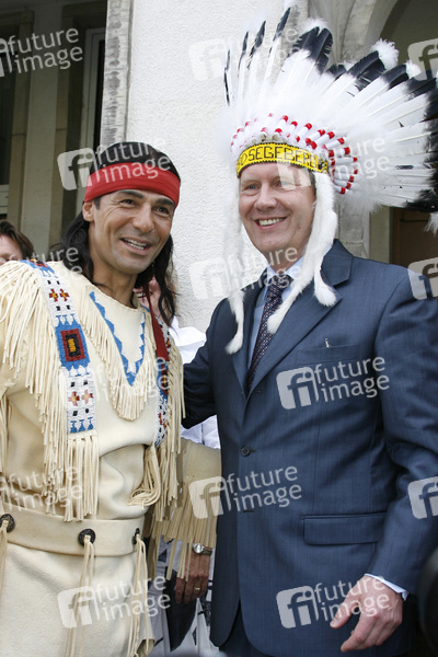 Das Ensemble der Karl-May-Spiele 2009 nimmt Ministerpräsident Wulff in den Kreis der Ehrenhäuptlinge auf. Dazu fanden sich die Mitwirkenden von 'Der Schatz im Silbersee' in der Niedersächsischen Staatskanzlei in Hannover ein.