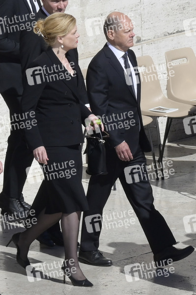 Julia Klöckner und Olaf Scholz bei der Trauermesse für den verstorbenen Papst Franziskus auf dem Petersplatz. Vatikanstadt, 26.04.2025