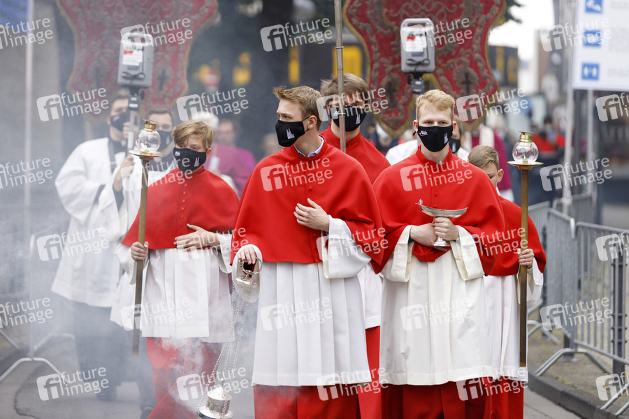 Religion, Glaube, Prozession, Messe, Gott, Gottesfurcht, Katholizismus, katholisch, Christen, Christentum, Kölner Dom, Prozession, Fronleichnam, Fronleichnamsprozession, Umzug, Weihrauch, Erzbistum Köln, Erzbischof, Hochfest, Gottesdienst, Messe, Pontifikalamt, katholische Kirche, bleibende Gegenwart Jesu Christi im Sakrament der Eucharistie, Fronleichnamsgottesdienst, Maskenpflicht, Kirche, Kirche in Zeiten von Corona, Jesus, Christus, Coronavirus, Coronakrise