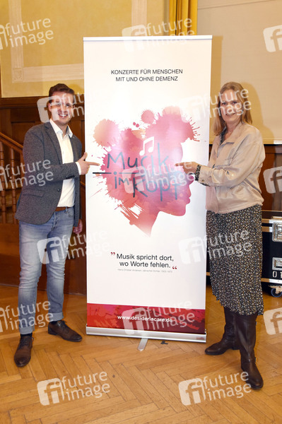 Tobias Boeck und Desiree von Bohlen von Halbach (Gründerin Desideria Care) beim Fototermin zum Programm 'Musik im Kopf' in Kooperation mit Desideria Care e. V. im Kleinen Theater. Haar, 18.04.2021