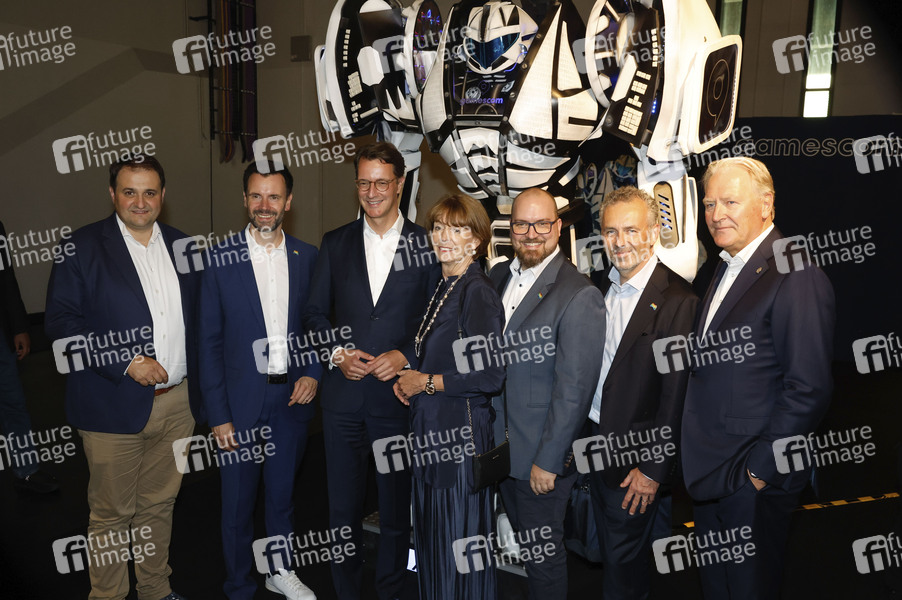 Nathanael Liminski, Felix Falk (Geschäftsführer des Game-Verbandes), Hendrik Wüst (Ministerpräsident von Nordrhein-Westfalen), Henriette Reker (Oberbürgermeisterin von Köln), Lars Janssen (Vorstandsvorsitzender des Game-Verbandes), Gast und Gerald Böse (CEO der Koelnmesse) auf der weltgrößten Computerspielmesse Gamescom 2024 in der KoelnMesse. Köln, 21.08.2024