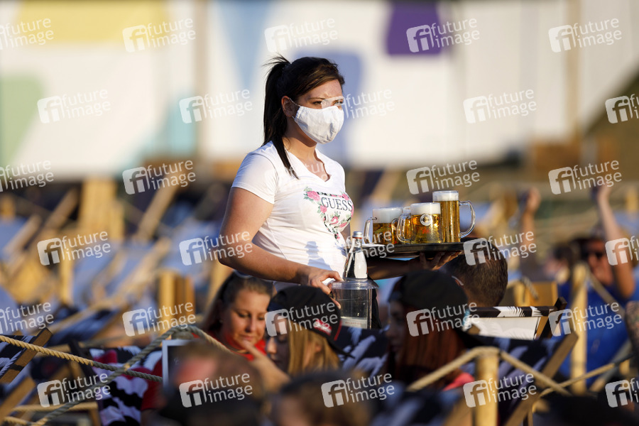 Eine Bedienung bringt Getränke beim Konzert von Mia Julia im Kulturgarten in der Bonner Rheinaue. Das Bonn Live Kulturgarten Open Air Festival 2020 ist Europas erstes Open Air Festival unter Corona-Auflagen wegen der Covid-19 Pandemie. Bedienungen tragen hier zum Schutz der Gäste Mundschutz. Bonn, 08.08.2020