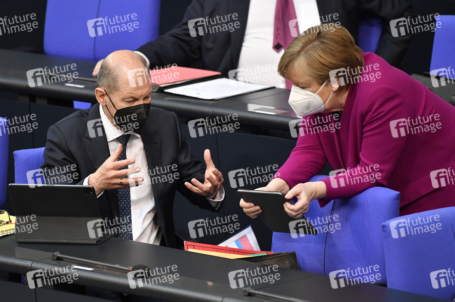 Olaf Scholz und Angela Merkel in der 218. Sitzung des Deutschen Bundestages im Reichstagsgebäude. Berlin, 25.03.2021