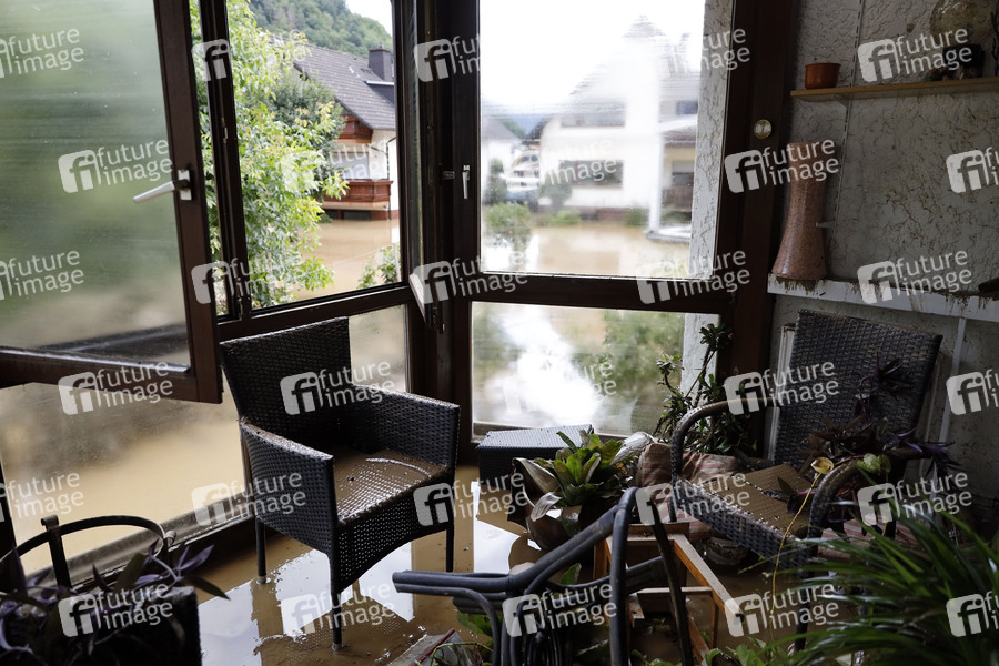 In der Eifel haben heftige Regenfälle und Dauerregen für Überschwemmungen und Überflutungen gesorgt. Im Ahrtal trat der Fluss vielerorts über die Ufer und überschwemmte nicht nur Keller sondern ganze Ortschaften. Im Bild der Ort Dernau (Landkreis Ahrweiler), der beinahe komplett von den Wassermassen geflutet wurde. Viele Menschen verloren alles. Dernau, 15.07.2021