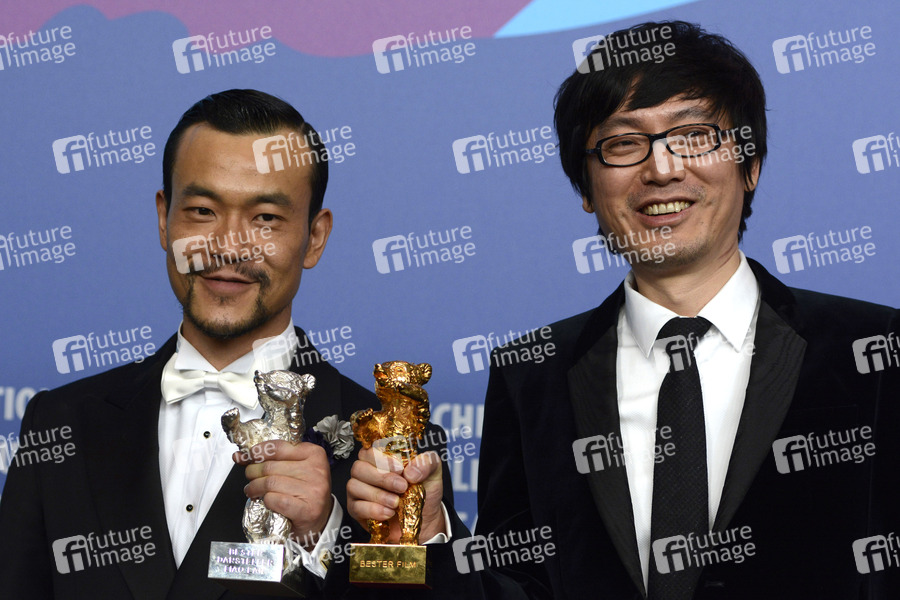 Liao Fan mit dem Silbernen Bären für den besten Darsteller in 'Bai ri yan huo / Black Coal, Thin Ice' und Diao Yinan mit dem Goldenen Bären für den besten Film 'Bai ri yan huo / Black Coal, Thin Ice' bei der Pressekonferenz mit den Preisträgern auf der Berlinale 2014 / 64. Internationale Filmfestspiele Berlin, 15.02.2014