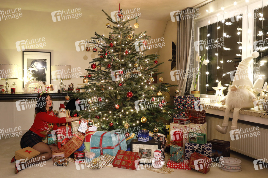 Adventszeit bei Dany Michalski. Exklusives Photoshooting mit Dany Michalski und Model Katey als Bodypainting-Weihnachtspaket unterm Weihnachtsbaum. Einbeck, 06.12.2020 - Bodypainting Künstler: Jörg Düsterwald
