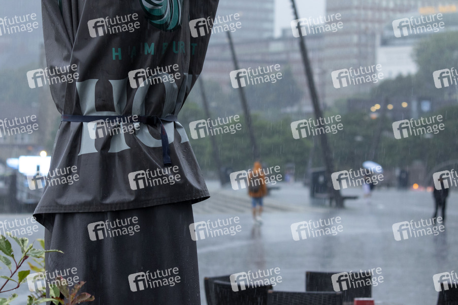 Starke Regenfälle und Gewitter sorgen diesen Sommer vermehrt für Unwetterwarnung: Eingeklappter Sonnenschirm und Touristen mit Regenschirmen unterwegs im Regen an den Landungsbrücken im Hafen. Hamburg, 14.08.2024