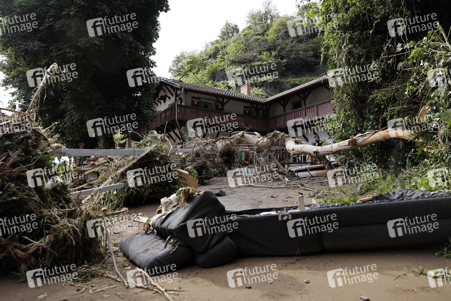 In der Eifel haben heftige Regenfälle und Dauerregen für Überschwemmungen und Überflutungen gesorgt. Im Ahrtal trat der Fluss vielerorts über die Ufer und überschwemmte nicht nur Keller sondern ganze Ortschaften. Im Bild die Straße zwischen Dernau und Walporzheim, die von den Fluten auf einem Abschnitt einfach mitgerissen wurde. Dernau, 15.07.2021
