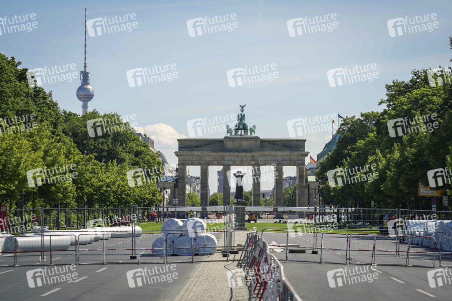 Aufbau der Fan-Zone zur Fußball-Europameisterschaft UEFA EURO 2024 am Brandenburger Tor. Die Straße des 17. Juni in Berlin-Mitte ist deswegen seit Montag für fast drei Monate gesperrt. Es wird Kunstrasen verlegt, der 100 Prozent recyclingfähig ist und nach Abschluss der Europameisterschaft auf Bolzplätzen in Berlin weiterverwendet wird. Berlin, 09.05.2024