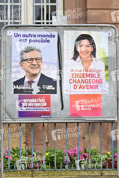 Wahlplakate mit Jean-Luc Melenchon (La France insoumise) und Anne Hidalgo (Parti socialiste) - Die Präsidentschaftswahl in Frankreich 2022 ist die zwölfte Wahl des Staatspräsidenten der Fünften Französischen Republik. Der erste Wahlgang findet nach Ablauf der laufenden fünfjährigen Amtszeit am 10. April 2022 statt. Sollte kein Kandidat im ersten Wahlgang die absolute Mehrheit er Stimmen erhalten, ist am 24. April ein zweiter Wahlgang vorgesehen. Straßburg, 05.04.2022