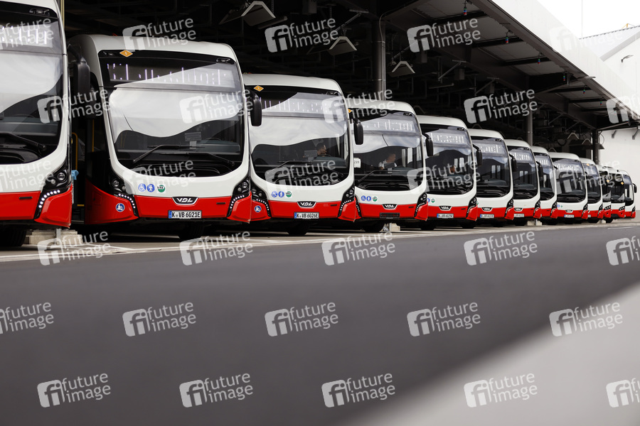 Elektrobusse beim Besuch von Umweltministerin Svenja Schulze und NRW-Verkehrsminister Hendrik Wüst bei der KVB Köln mit symbolischer Inbetriebnahme der neuen Ladeinfrastruktur für Elektro-Busse. Köln, 29.06.2021